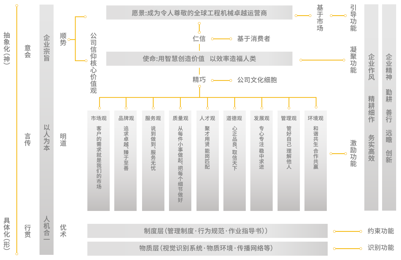愿景位于文化框架的最上方,表明龍工文化是一種以愿景領航的文化;它基于市場提出,具有引導的功能。使命緊隨其后,是基于消費者提出的,闡明了公司存在的理由和價值。這兩項是順勢而為的——因為不管我們是否做好了充分的準備,工程機械市場已經是一個國際化的市場;成為國際化的大公司不僅是龍工自身發展的需要,更是市場競爭的客觀要求。同時,工程機械品質的好壞由專家鑒定的時代已經過去,評鑒產品品質的主體是市場、是終端用戶,我們所研發制造的產品和精心提供的服務必須滿足用戶的需求,得到用戶的鐘愛,所以使命強調了消費者的導向。